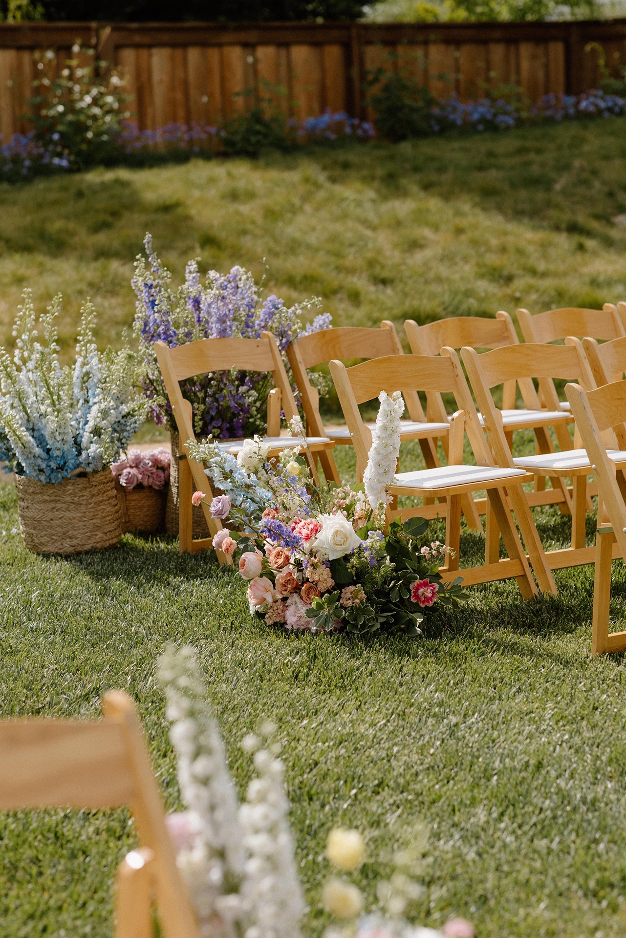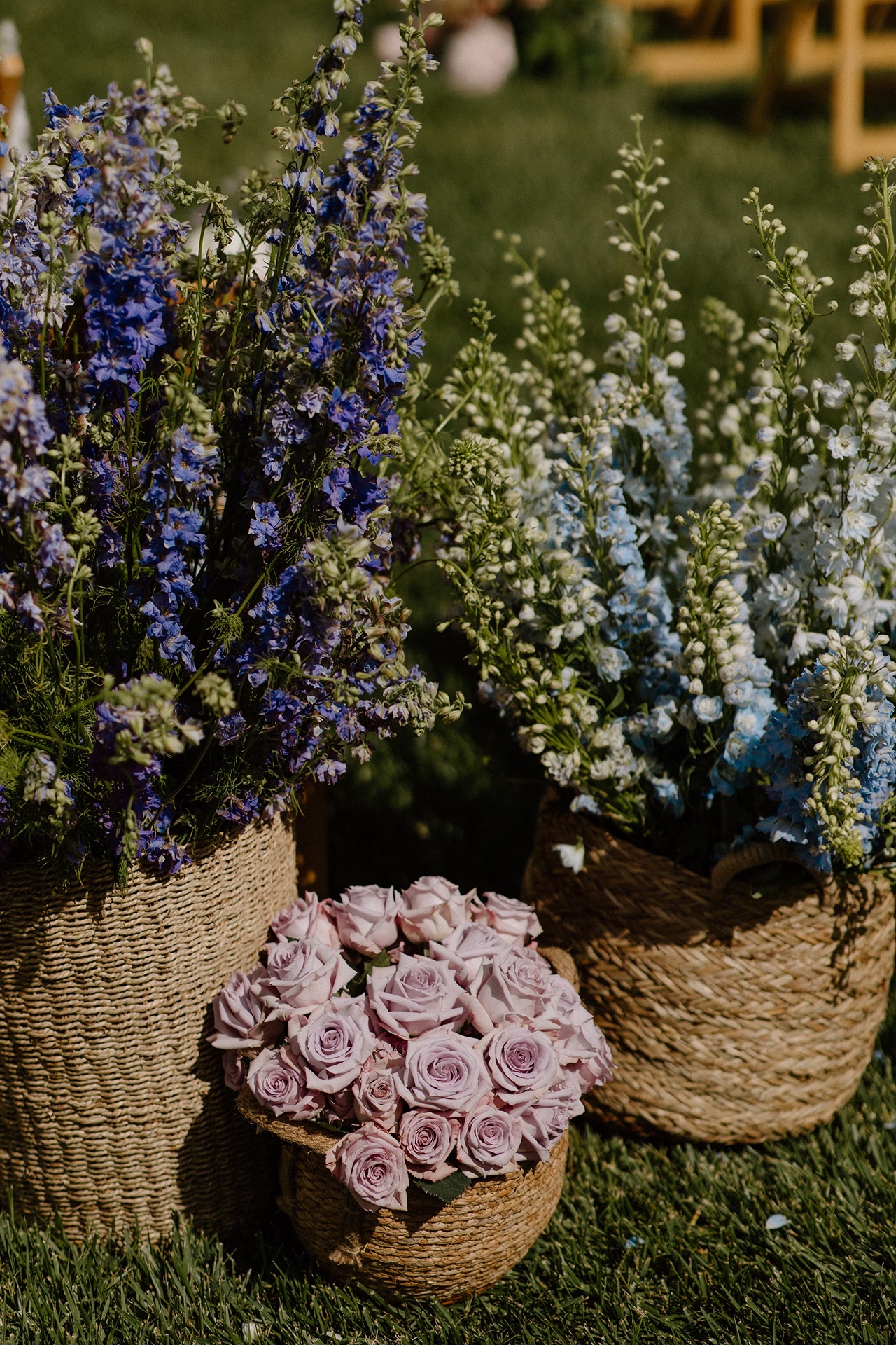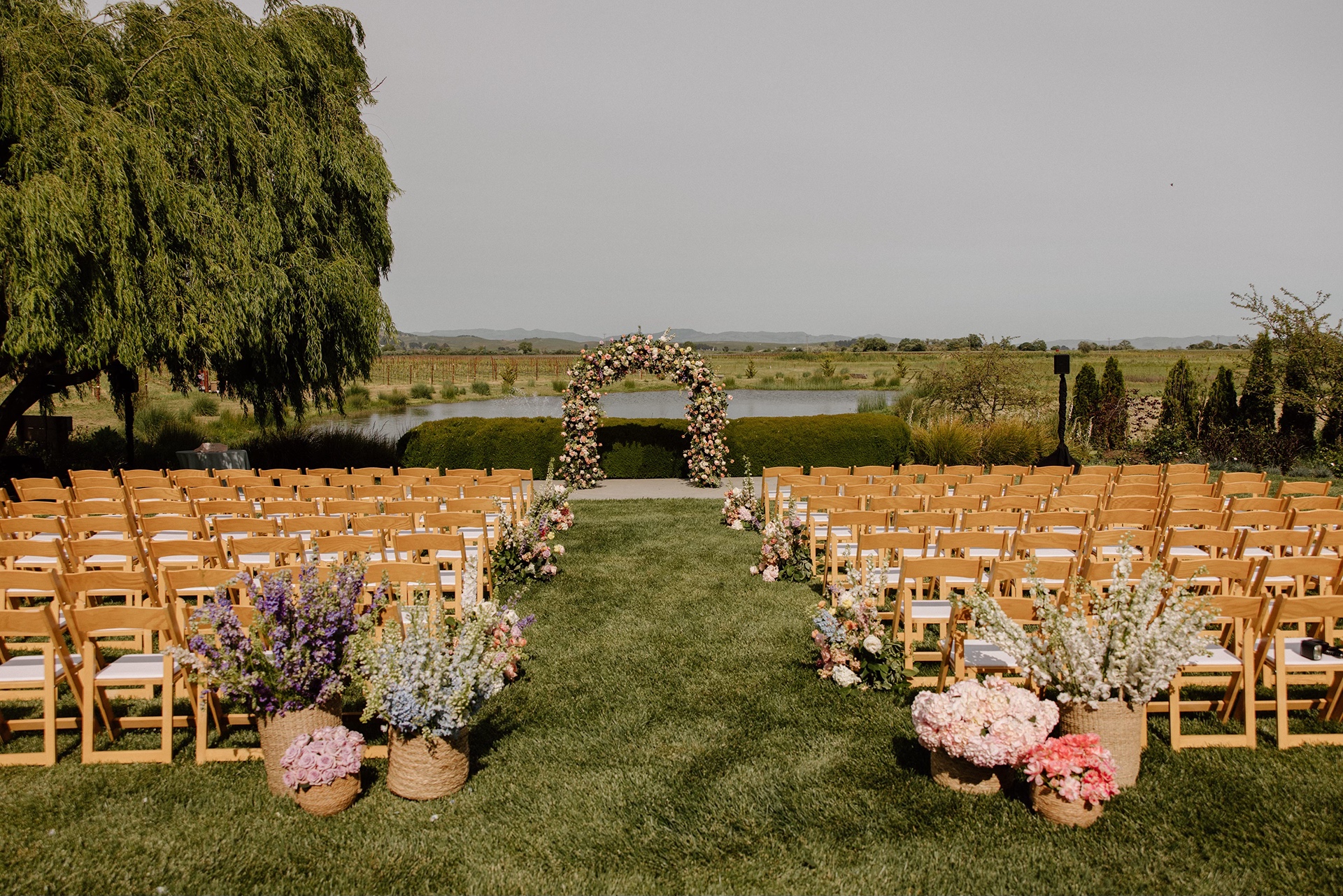 Baskets of lush blooms lined the aisle and created the spring garden feeling Carly envisioned. The ceremony felt romantic without being overly formal, which was perfectly aligned with the relaxed elegance Harrow Cellars is known for.